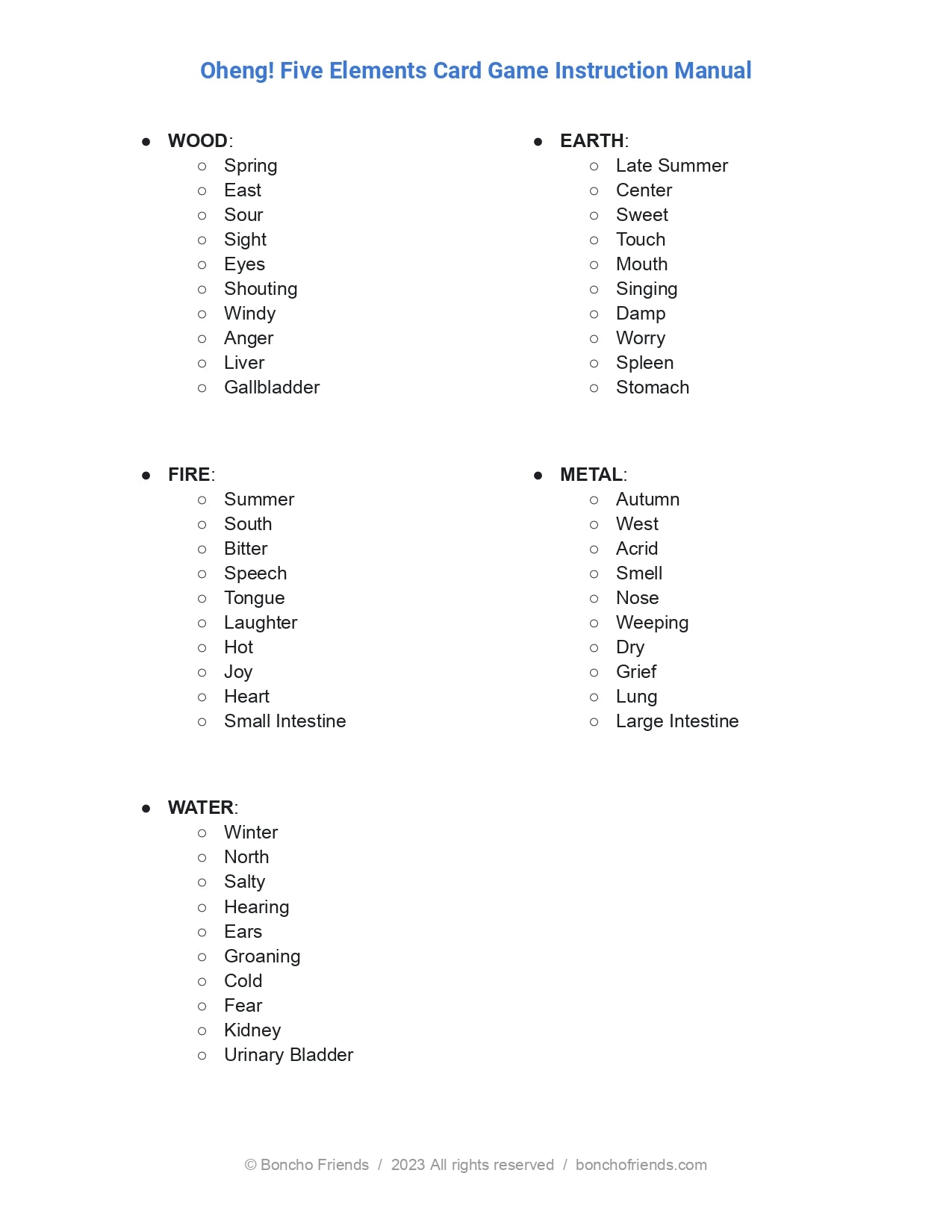 - Based on TCM Five Elements Theory: Oheng! Five Elements Card Game draws its inspiration from TCM's Five Elements Theory, also known as Wuxing. Discover the deep-rooted connections between wood, fire, earth, metal, and water.