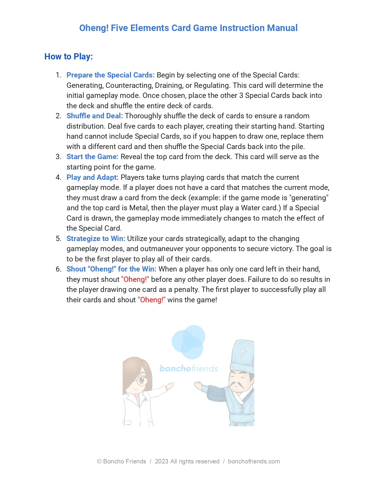 - 10 Unique Characteristics: Each element card in Oheng! is meticulously crafted with ten distinct characteristics, including the represented Zang Fu organs, sensory organs, emotions, and more. Immerse yourself in the intricate details of each element as you play.
