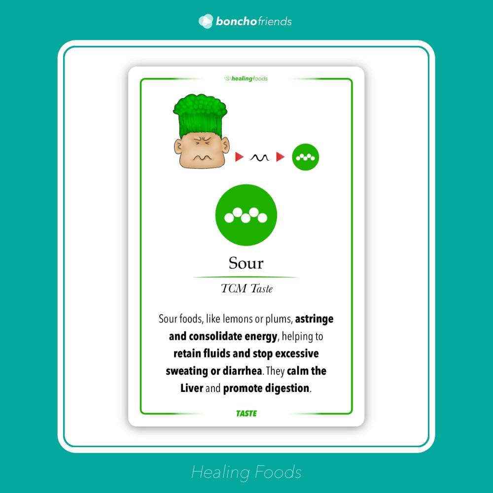 - Sour (Wood / Liver–Gallbladder) – Astringes and consolidates energy, retains fluids, calms Liver Qi, aids digestion.