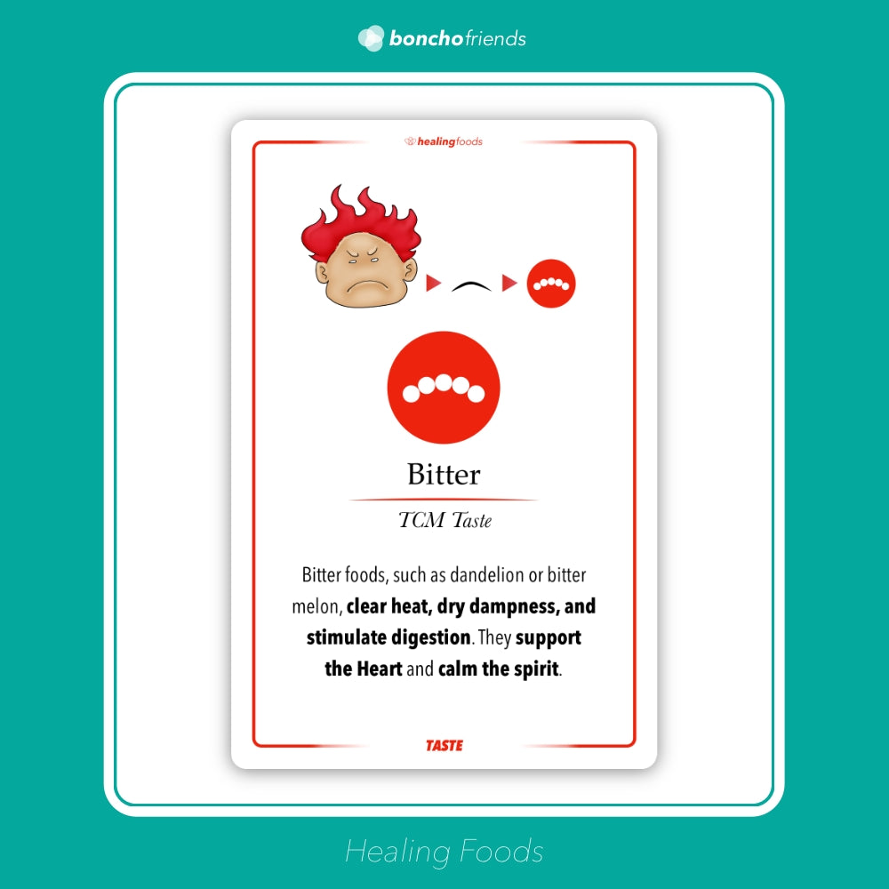 - Bitter (Fire / Heart–Small Intestine) – Clears Heat, dries Dampness, supports the Heart, calms the Spirit.