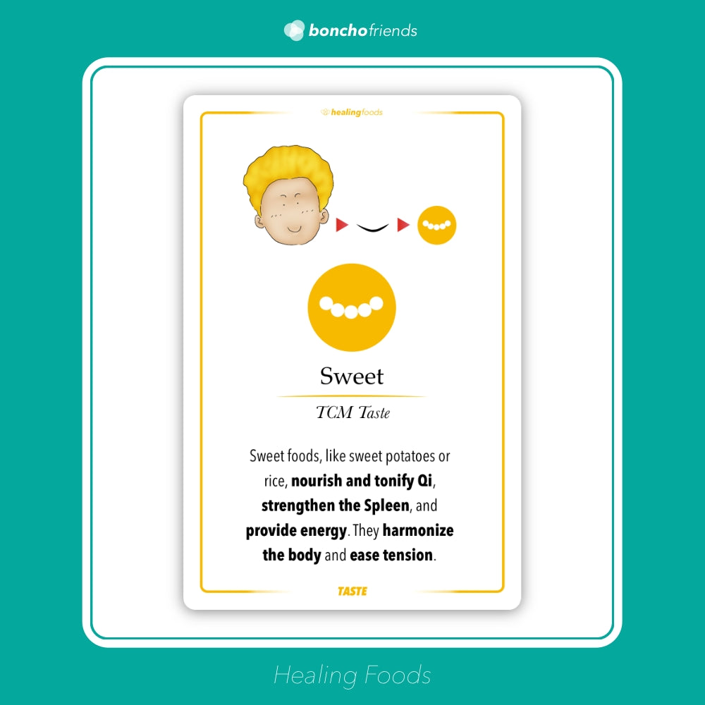 - Sweet (Earth / Spleen–Stomach) – Tonifies Qi, strengthens the Spleen, harmonizes the body, eases tension.