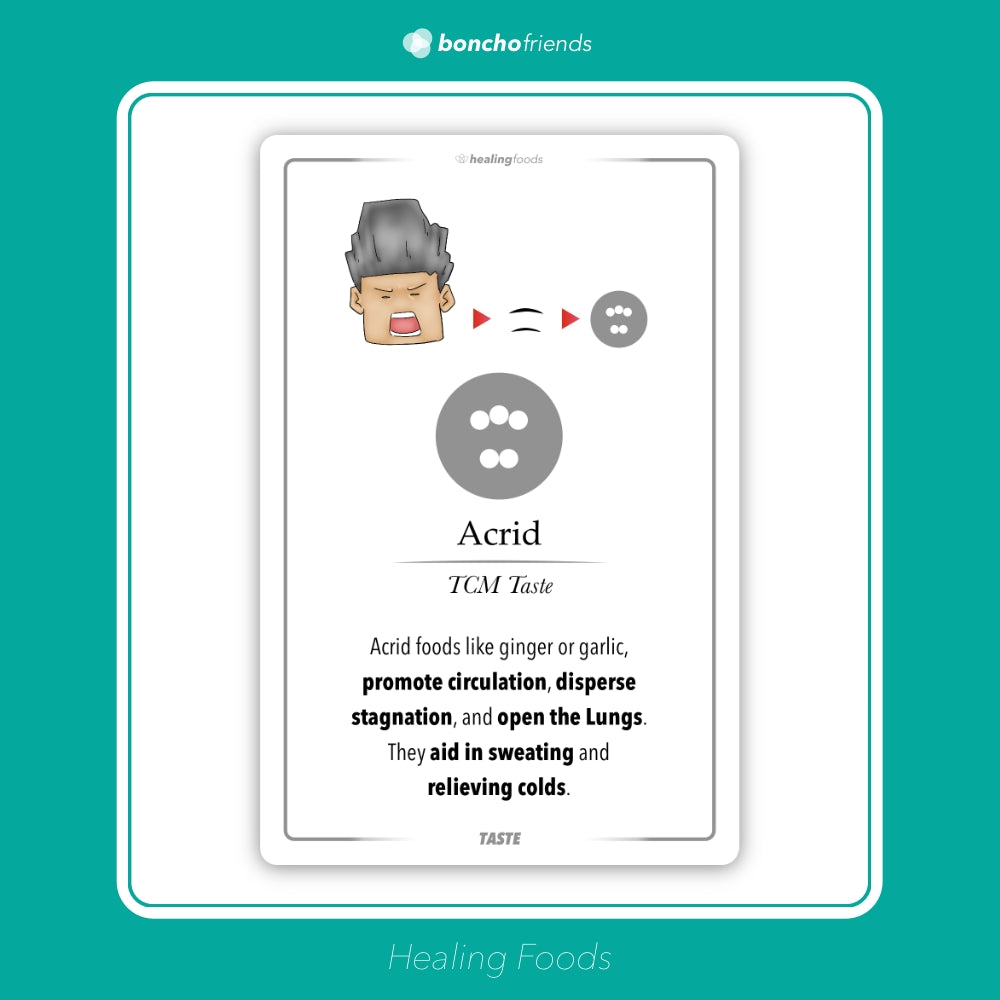 - Acrid (Metal / Lung–Large Intestine) – Promotes circulation, disperses stagnation, opens the Lungs, relieves colds.