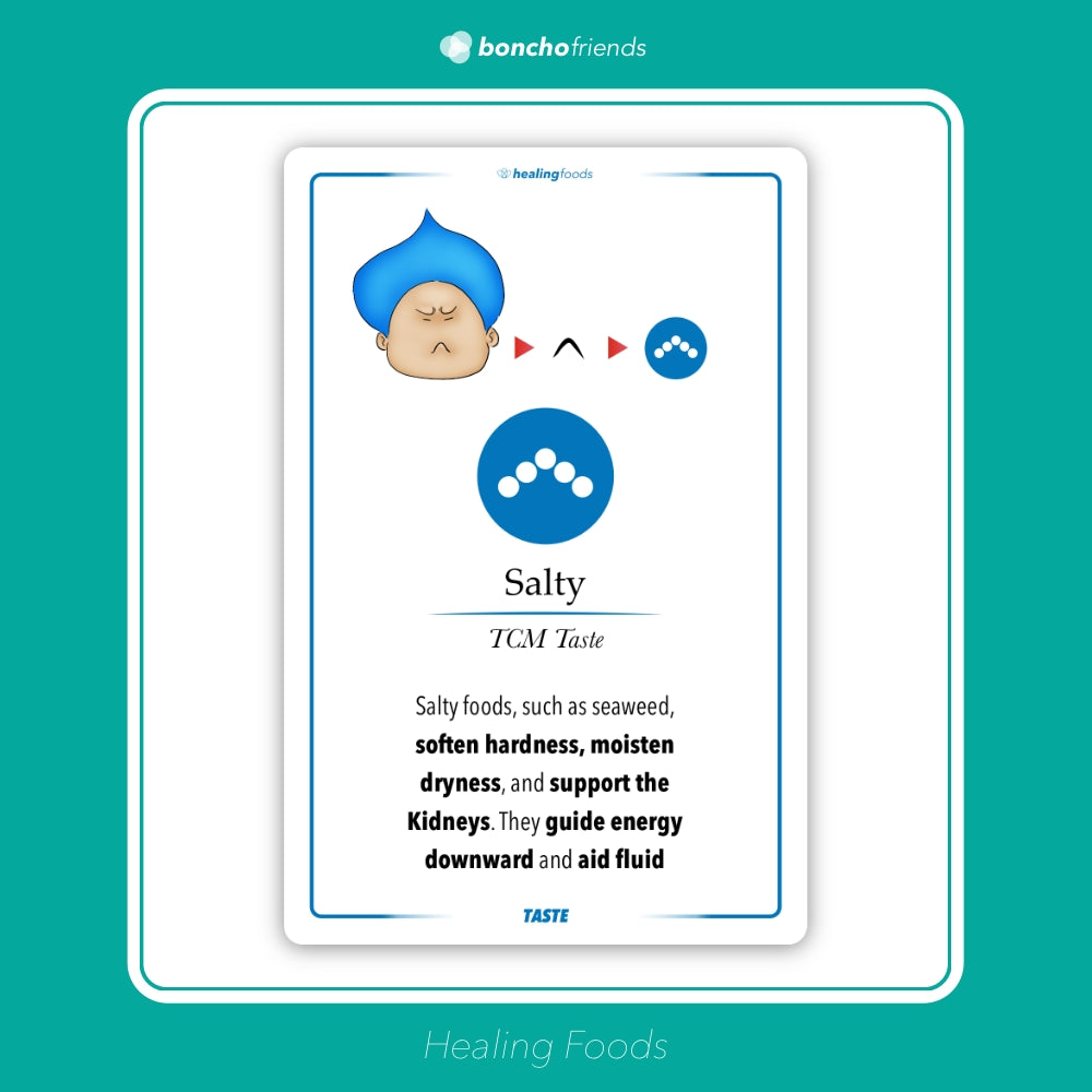 - Salty (Water / Kidney–Bladder) – Softens hardness, moistens dryness, supports Kidneys, balances fluids.