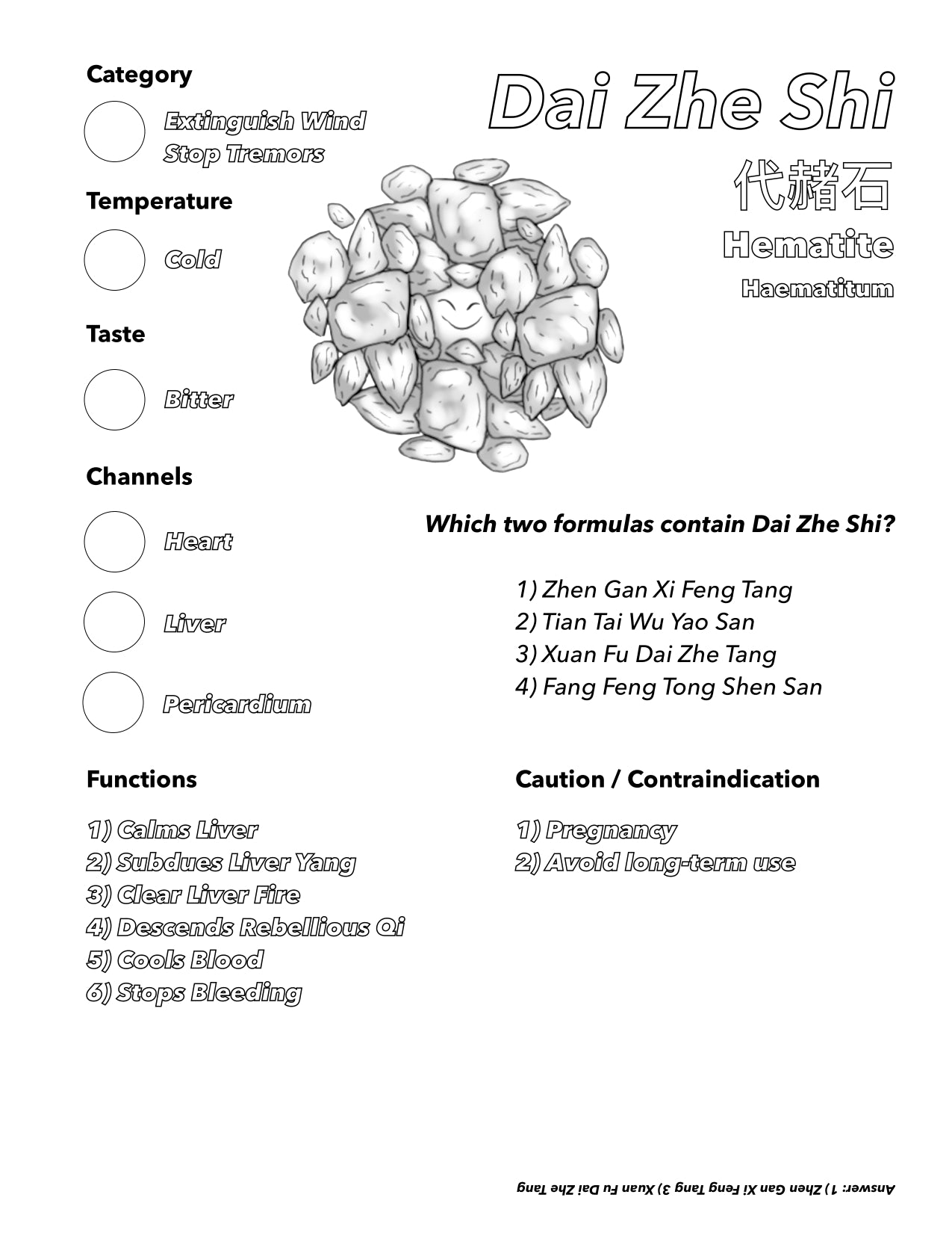 * Single herbs list is directly from The Chinese Herbology Content Outline, NCCAOM. Reference: Chinese Herbal Medicine Materia Medica, 3rd Edition, Bensky.